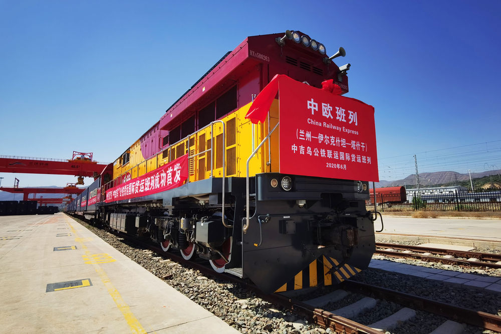 在甘肃(兰州)国际陆港准备发车的“中吉乌”公铁联运国际货运班列。新华社记者 范培珅 摄